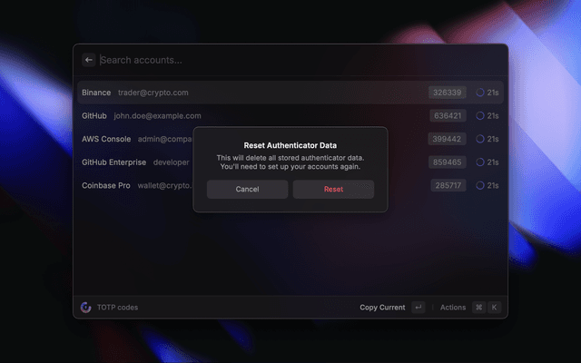 Reset authenticator dataCmd+Shift+R