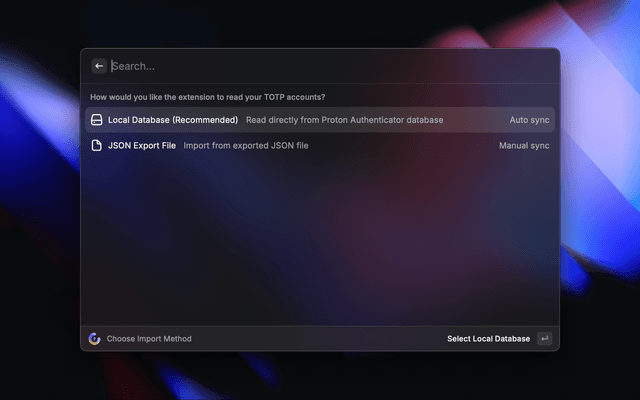 • Local Database (Live) - Reads directly from Proton Authenticator's local database. Accounts sync automatically on every launch.