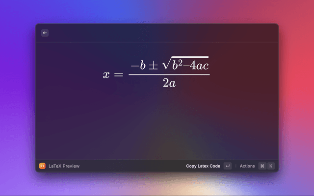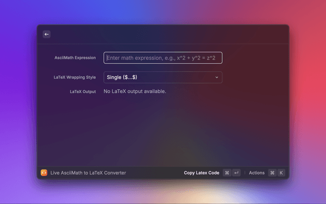 Convert AsciiMath expressions to LaTeX with a live preview in Raycast.