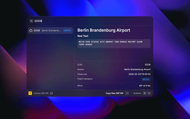 Quickly lookup raw METAR weather data by ICAO code.