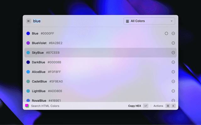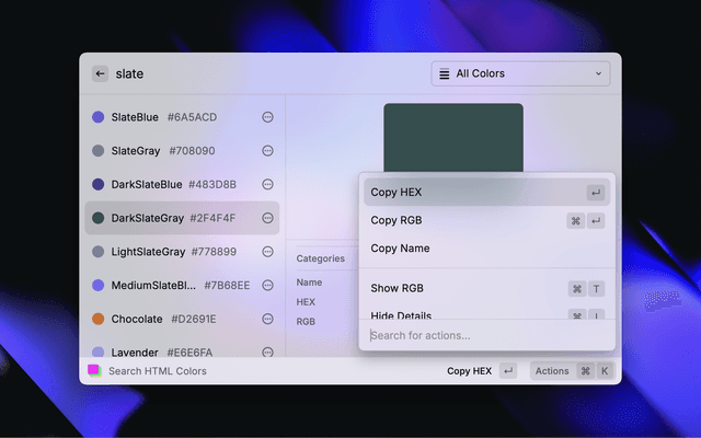 A Raycast extension that helps you quickly look up HTML colors by name. Perfect for web developers and designers who need to find the right color codes without remembering exact names.