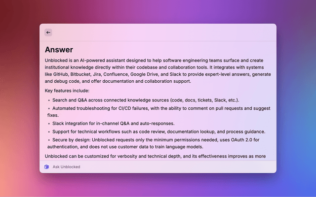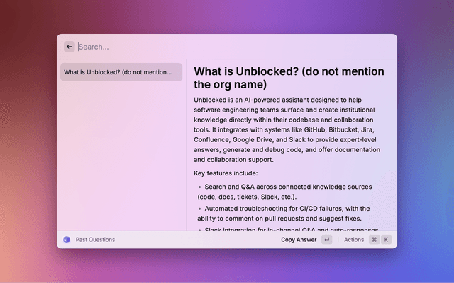 Ask questions and receive answers from the Unblocked Answers API. Requires an enterprise subscription and API key-- documentation for how to obtain an API key can be found at Unblocked.