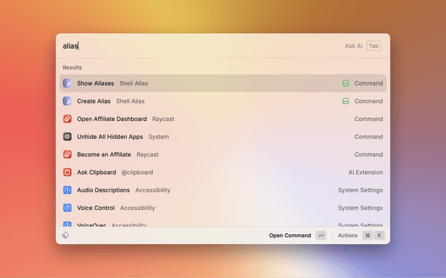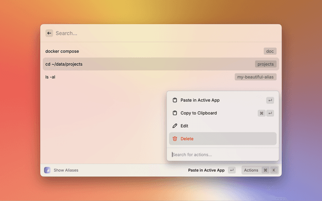Quickly retrieve your shell aliases, paste and manage them directly from Raycast.