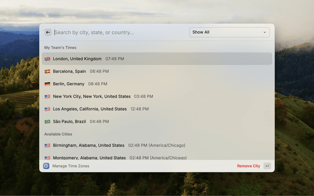 A Raycast extension that allows you to see what time it is in different cities and countries around the world. Easily track multiple time zones for your distributed team.