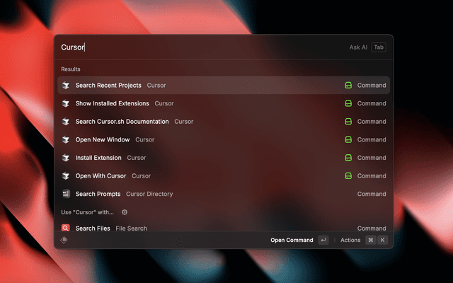 Control Cursor directly from Raycast - Search and open recent projects, handle extensions and commands.
