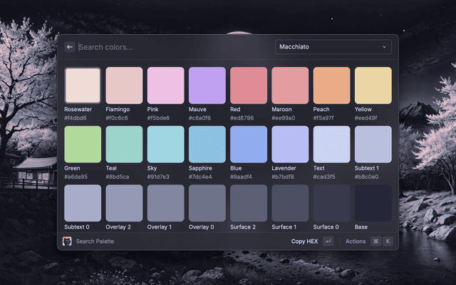 Catppuccin has hundreds of ports (such as the Catppuccin for Raycast port), covering a wide range of applications, tools, websites, and just about anything you can imagine!