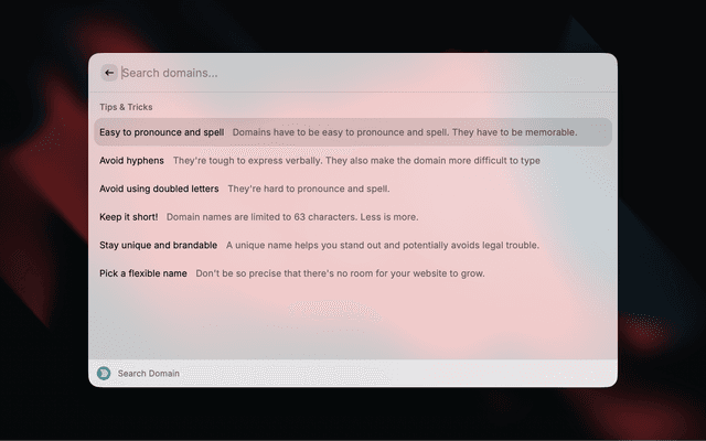The Domain Research API lets you programmatically retrieve algorithmic domain search results, and check domains for detailed availability.