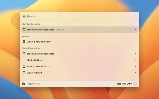 See what time entry is currently in your Menu Bar. Click to see the list of recent time entries, which allows you to resume them.