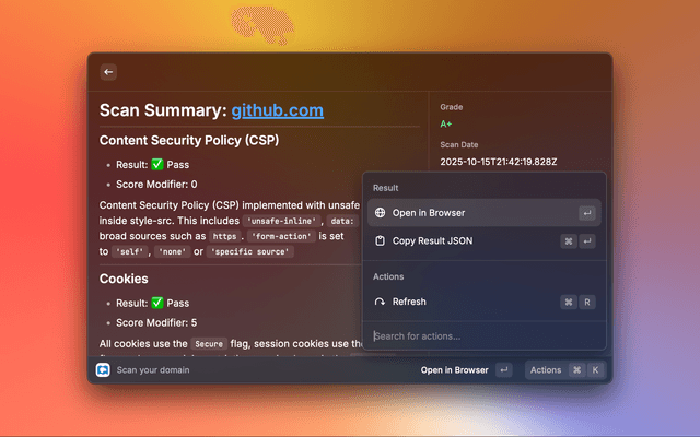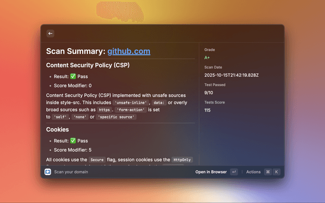 Run a HTTP Observatory Scan on your domain, provided by MDN