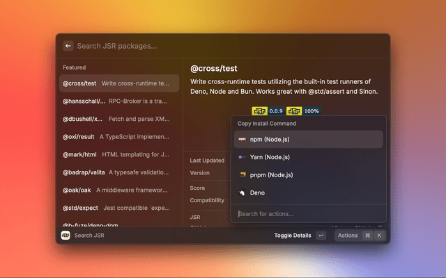 Search through JSR, the open-source package registry for JavaScript/TypeScript.