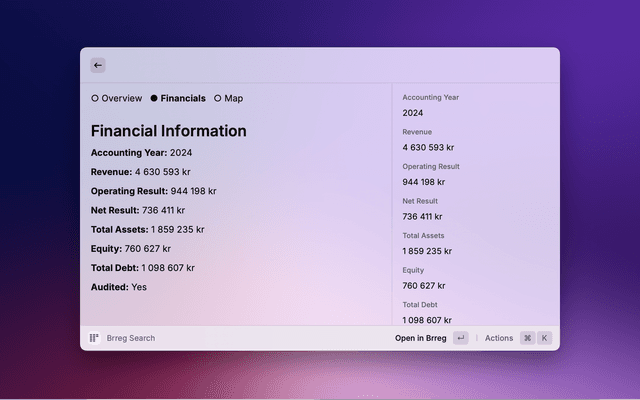 Search and retrieve information about Norwegian companies (Enhetsregisteret) directly from the Raycast command bar. The extension uses the official Brønnøysund Register Center (Brreg) API to find companies by name or organisation number.