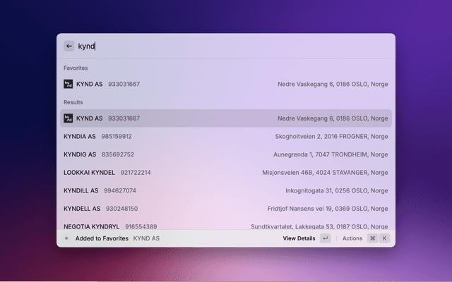 • ⌘⇧Enter: Open company in Brønnøysundregistrene