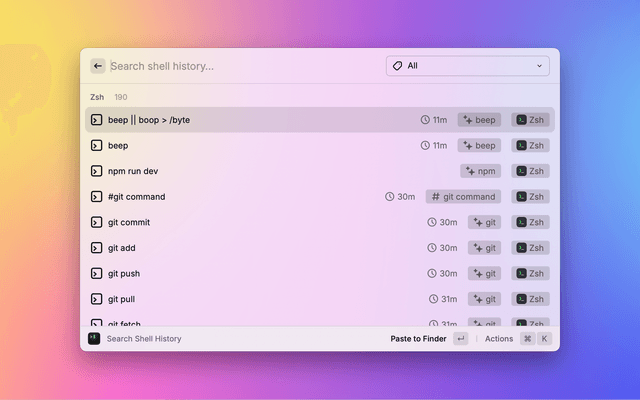 Search shell command history from zsh, bash, and fish.