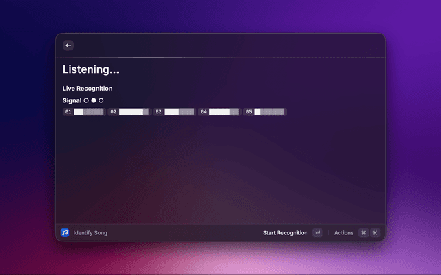Recognize the song currently playing around you from Raycast using a macOS Shortcut powered by the native Recognize Music (Shazam) action.