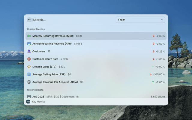 A Raycast extension that gives you quick access to key business metrics from ChartMogul right from your command bar. Instantly view MRR, ARR, churn, customer counts, and more without leaving your workflow.
