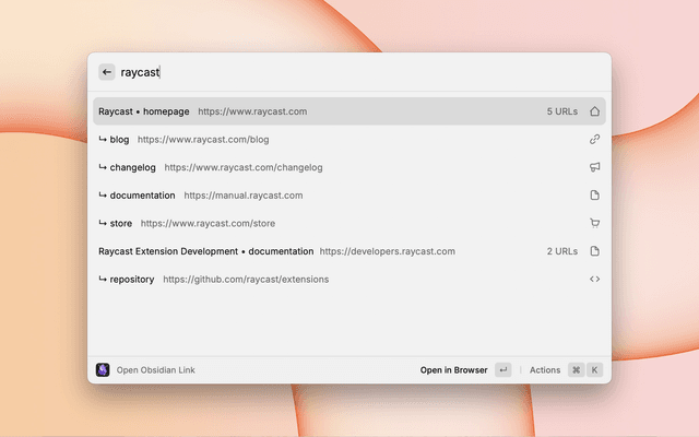 • Powerful Search: Leverage Obsidian's existing organization with Raycast's quick access