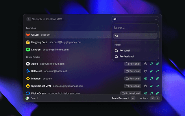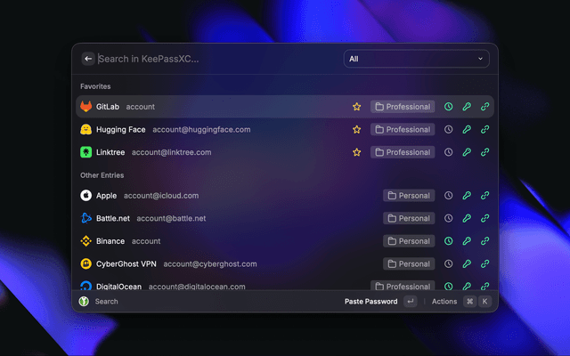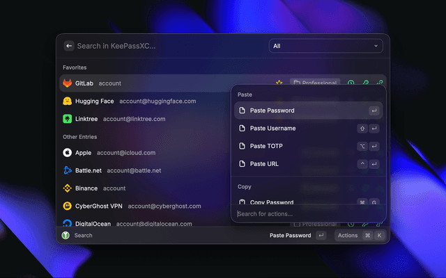 Search entries  ⸱  Copy & paste any field  ⸱  Generate TOTP codes  ⸱  Mark entries as favorites