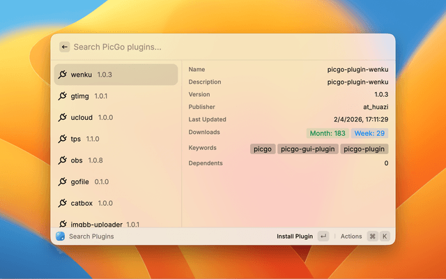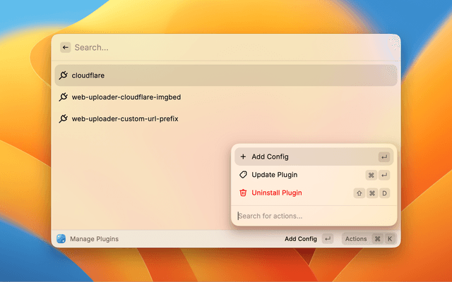 • Plugin Management: Search, install, update, and uninstall PicGo plugins directly from Raycast via NPM.