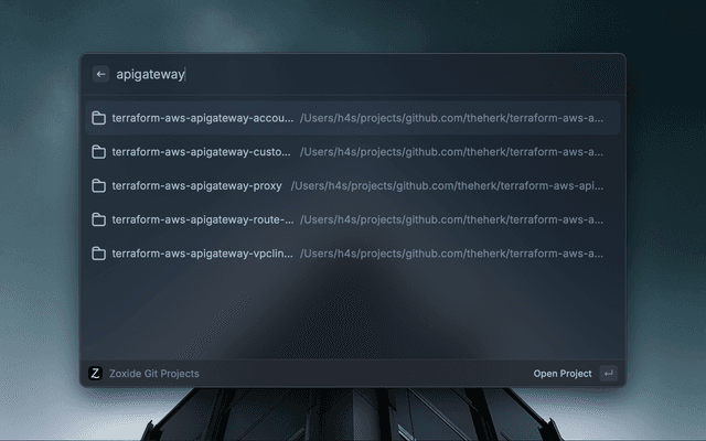 I use and love zoxide ❤️. With this extension, all the directories returned by zoxide query -l (i.e. the directories you use) are filtered to just those that are git repositories and ordered by most frequently used. From there, this extension allows you to fuzzy find a specific project, then open that project with the tool of your choice. For me, zed.