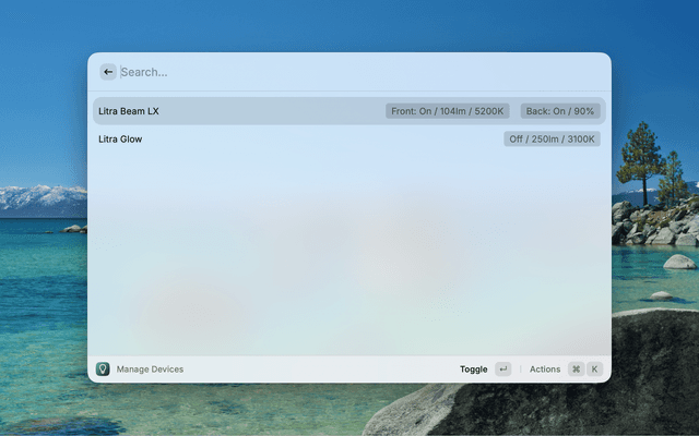 This Raycast extension allows you to manage your USB-connected Logitech Litra Glow and/or Logitech Litra Beam light(s) from Raycast, turning them on and off and setting their brightness and temperature. For Litra Beam LX devices, you can also control the colorful back light, including turning it on and off, setting its brightness, and changing its color.