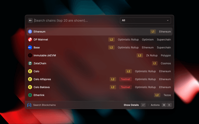 • Ecosystem Filtering: Filter chains by ecosystem (Ethereum, Polygon, Arbitrum, etc.)