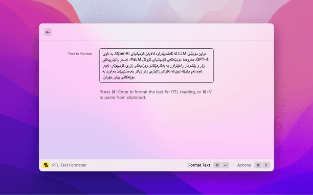 This raycast extension fixes formatting issues in texts that mix Right-to-Left (RTL) and Left-to-Right (LTR) languages, like Kurdish and English.