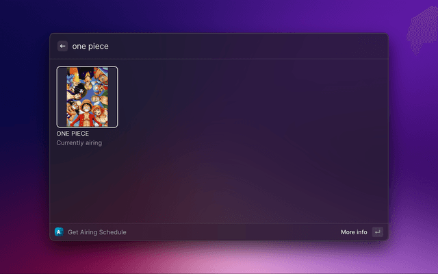 This extension pulls data from Anilist, mainly the airing schedule. Additionally, you can also open the anime to watch on one of the available streaming sites from Raycast itself.