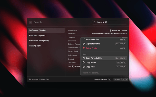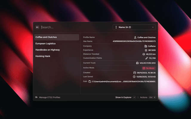 Manage your Euro Truck Simulator 2 and American Truck Simulator profiles directly from Raycast. View and rename your game profiles with ease.